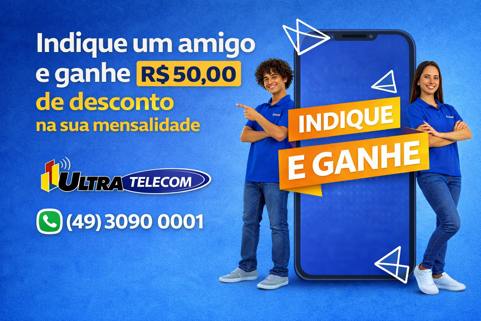 Compartilhe com amigos e ganhe desconto na sua mensalidade. Você indica, a Ultra Telecom cuida do resto!